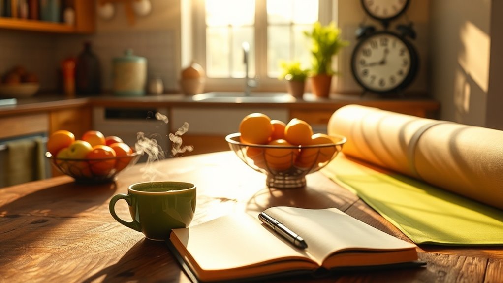 If you want to boost your energy levels, start by waking up earlier to seize the day. Hydrate first thing to kickstart your metabolism. Incorporate 15-30 minutes of exercise to get your blood flowing. Add five minutes of mindful meditation to sharpen your focus and reduce stress. Finally, fuel your body with a nutrient-packed breakfast, like oatmeal with berries or a veggie omelet, for lasting energy. Discover how these habits can transform your mornings even further!