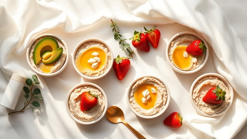 Oatmeal masks can totally transform your skin overnight! Start with a hydrating mask combining oatmeal and yogurt to lock in moisture. For gentle exfoliation, mix oatmeal and honey, revealing smoother skin. If you’re battling irritation, soothing oatmeal and aloe vera can help calm things down. Want a brighter complexion? Try oatmeal with lemon juice to lighten dark spots. Lastly, oatmeal paired with banana boosts hydration and fights fine lines. Stick around to discover even more skin-loving tips!