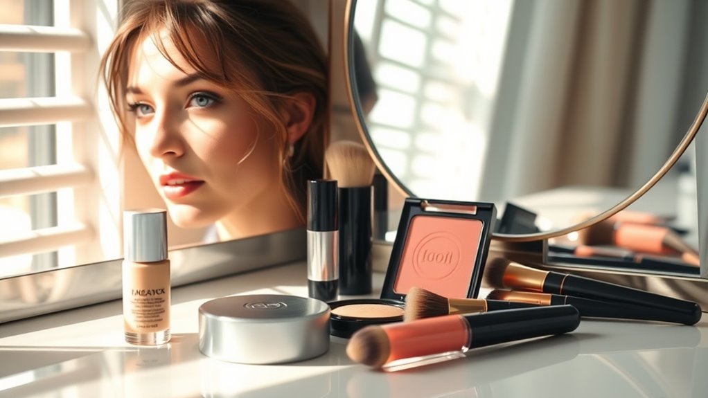To instantly freshen up in just five minutes, start with a quick cleanse and apply a lightweight moisturizer and sunscreen. Add a touch of vitamin C serum for extra glow, then use a tinted moisturizer for a natural look. Blend cream blush onto your cheeks and highlight your eyes’ inner corners. Finish with mascara and a tinted lip balm to bring it all together. For even more tips on maintaining that fresh look, there’s more to explore!
