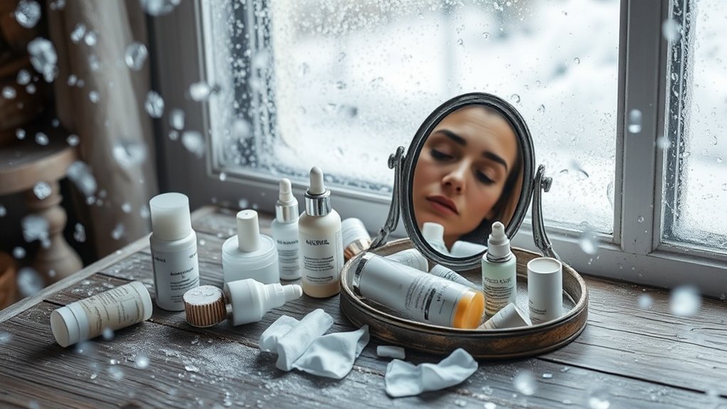 Your winter skincare routine might not be working because you’re likely neglecting hydration and sun protection. Cold, dry air strips moisture from your skin, causing dryness and irritation. If you’re skipping exfoliation, dead skin can build up, making products less effective. To fix it, incorporate hydrating ingredients like hyaluronic acid, use a humidifier indoors, and apply thick moisturizers right after bathing. There are more essential tips that can make a difference in your winter skincare.